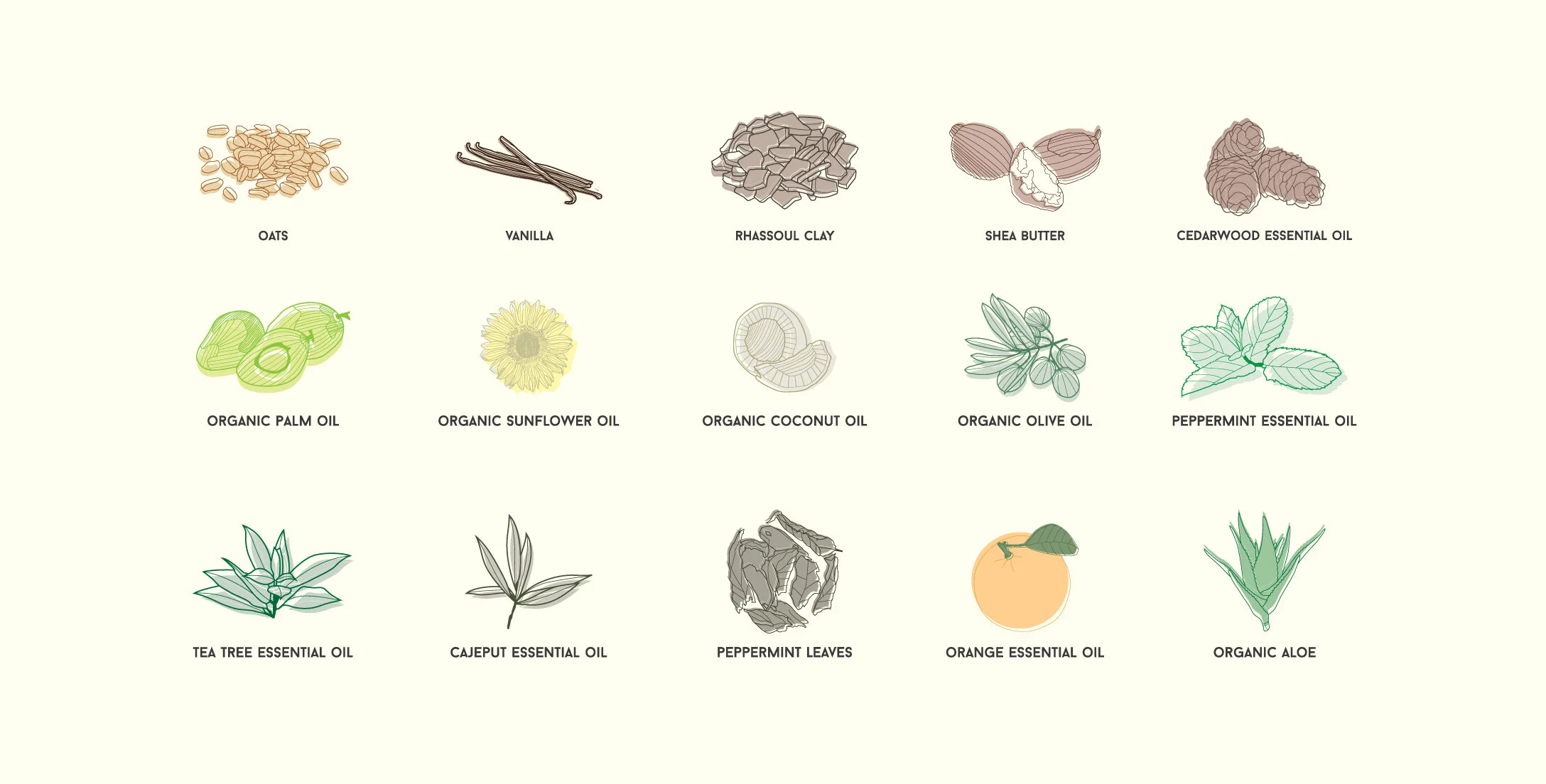I illustrated the ingredients used in Iron Lion Soap's bars. The purpose was to inform consumers about what goes into the soap, in a fun and simple way. A vintage look was emphasized through the choice of font and color scheme.