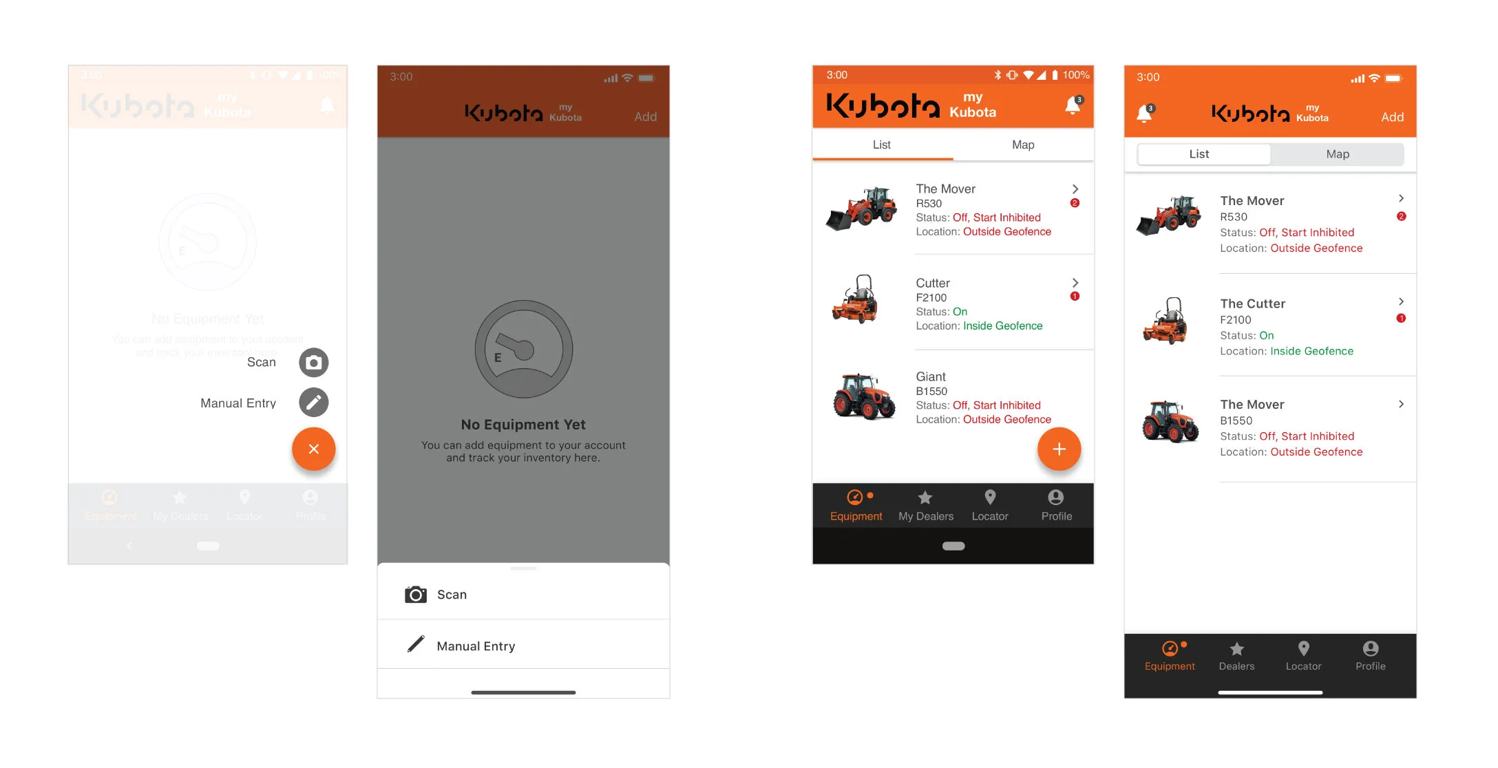 Designs were native mobile applications for both Android and iOS. Aligning with Material Design and iOS Human Interaction Guidelines were important for implementing designs. Accessibility was another factor I paid close attention to because of Kubota’s target market.